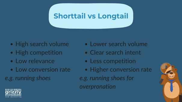 Longtail keywords, on the other hand, indicate that a searcher is further along in the customer journey. They know more specifically what they need. As a result, these searches align better with a targeted offer and the likelihood of action increases.